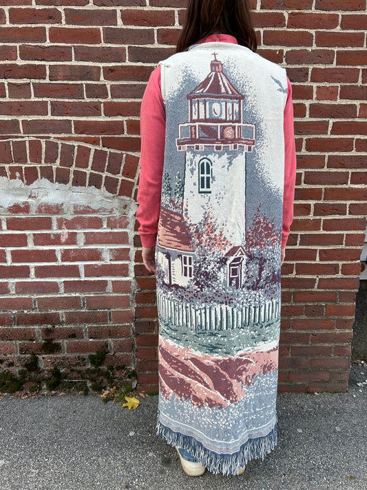 Each Swanket is made from second hand tapestry blankets, making them warm and comfortable in addition to being wearable art. Their styles vary from vests to flare sleeves with fringe.