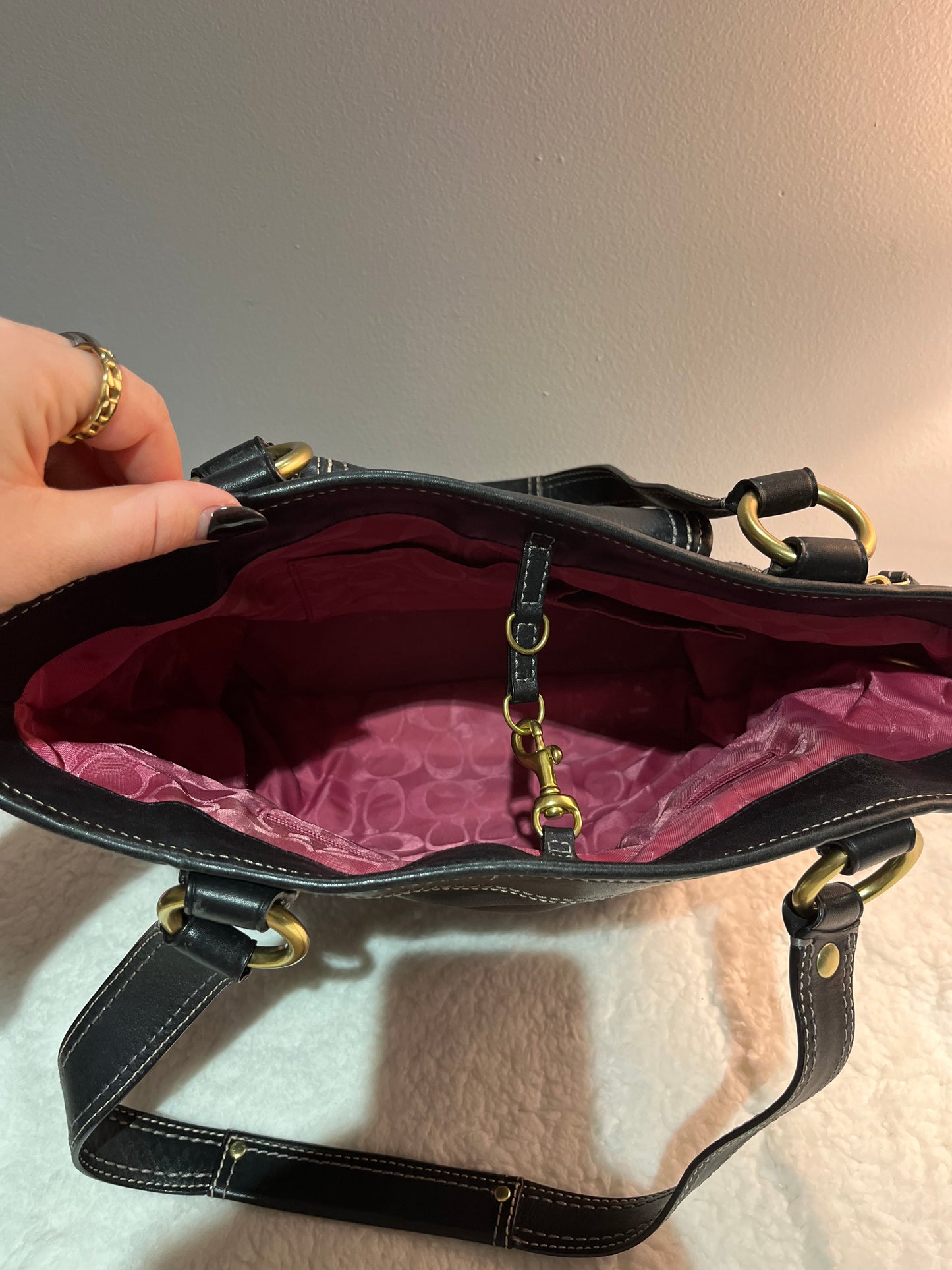 This bag is part of the coach legacy collection. Pink lining with pockets. Exterior side zipper pockets work perfectly! This bag is in perfect condition with no signs of wear. Pocket in front has clasp closure. Strap is 10”. Price is based off condition, age & style.