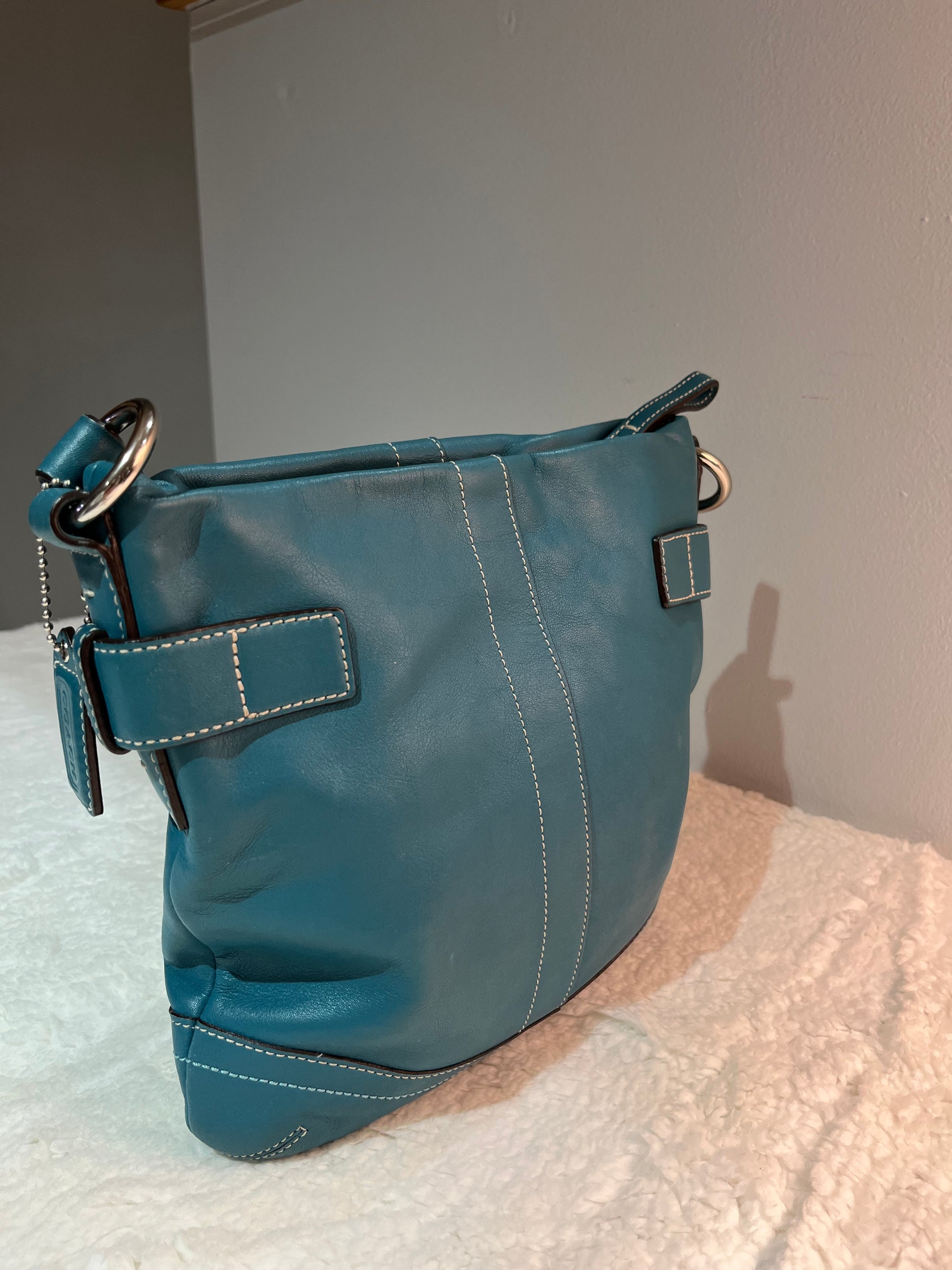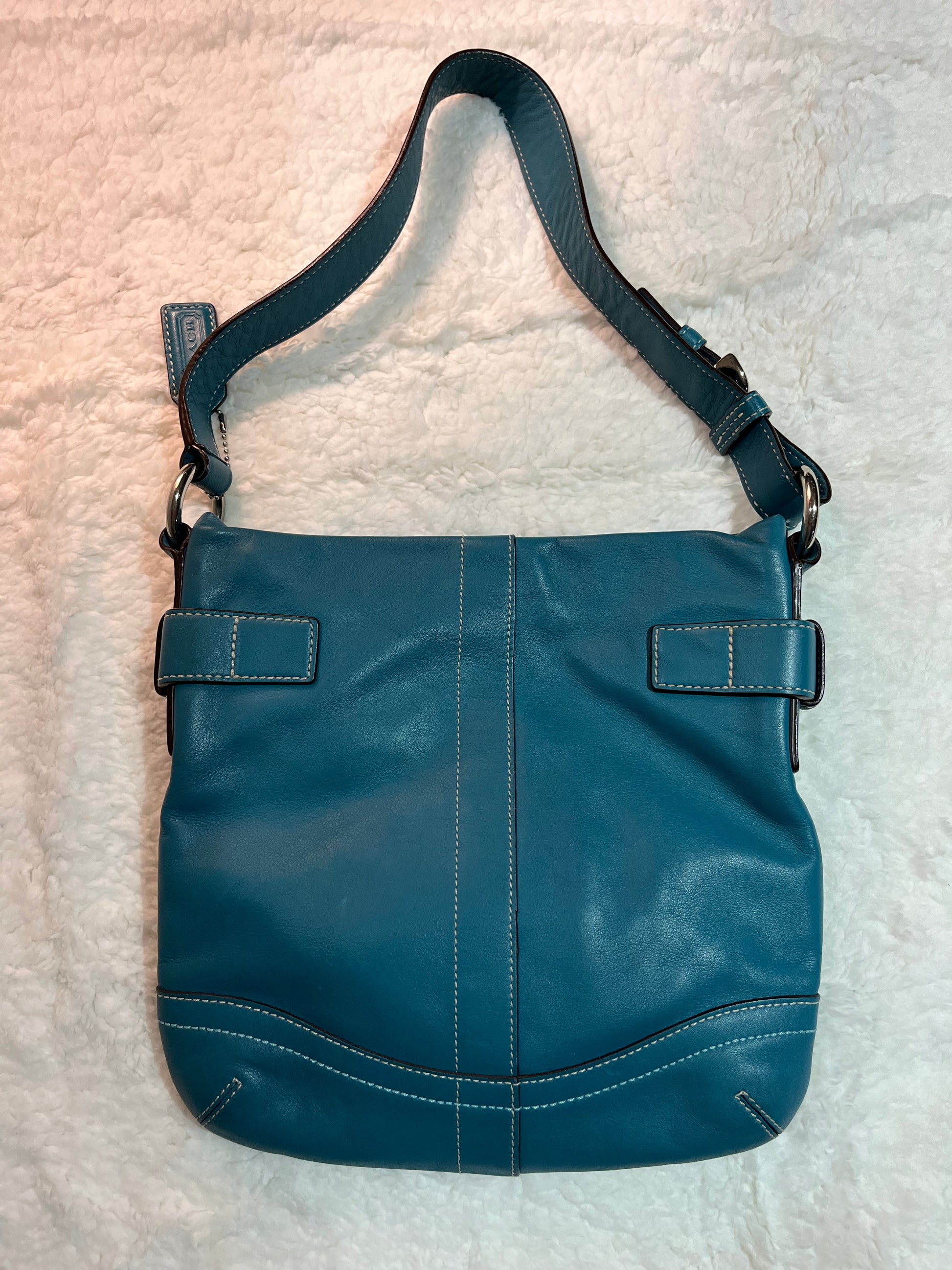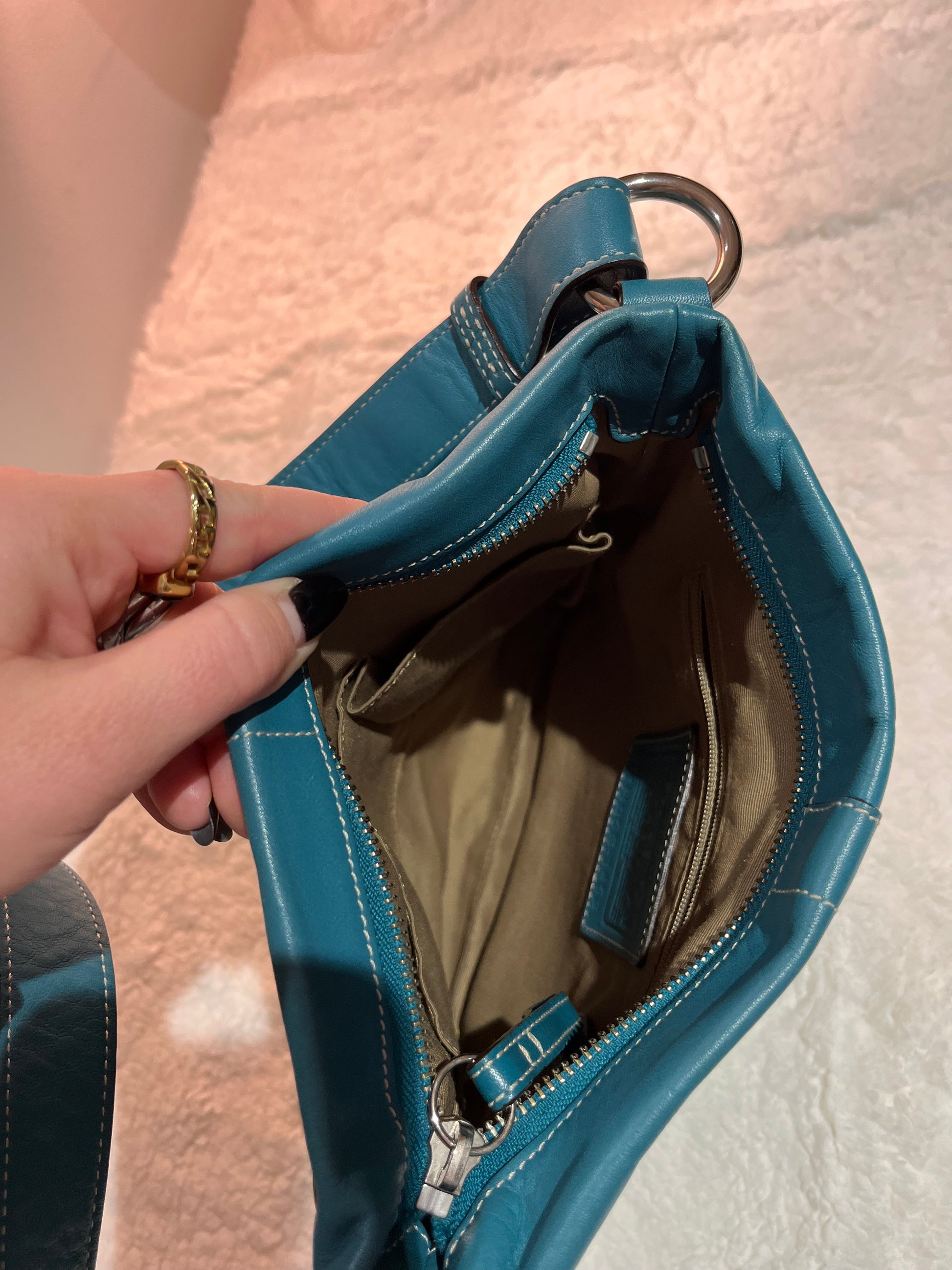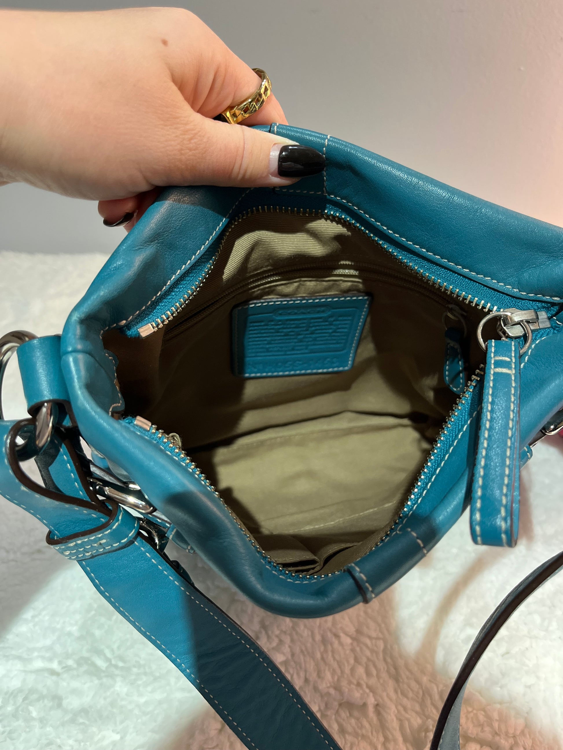 Teal coach bag ion perfect condition, no signs of wear on interior or exterior! Zipper pocket on inside as well as other smaller open pockets.