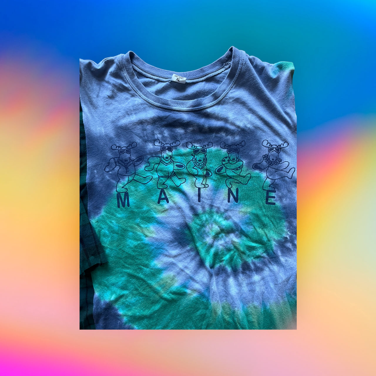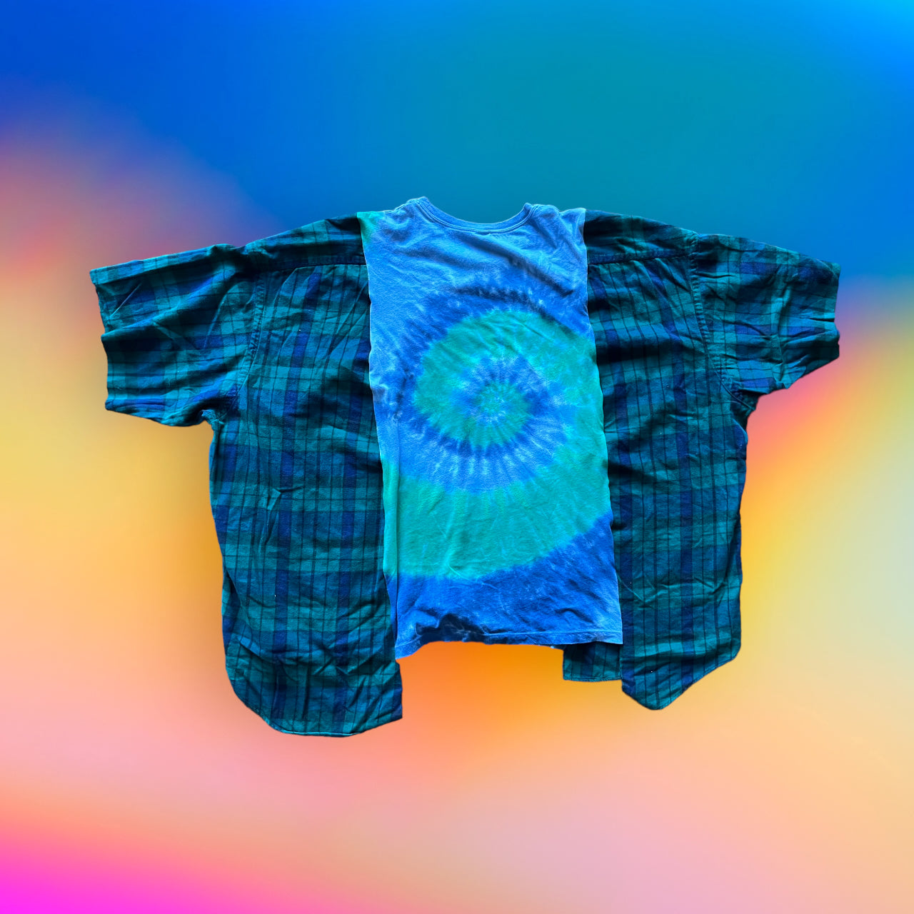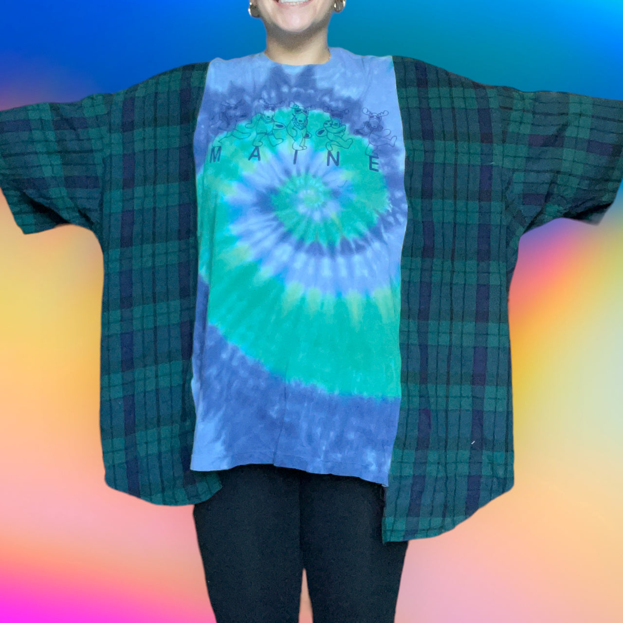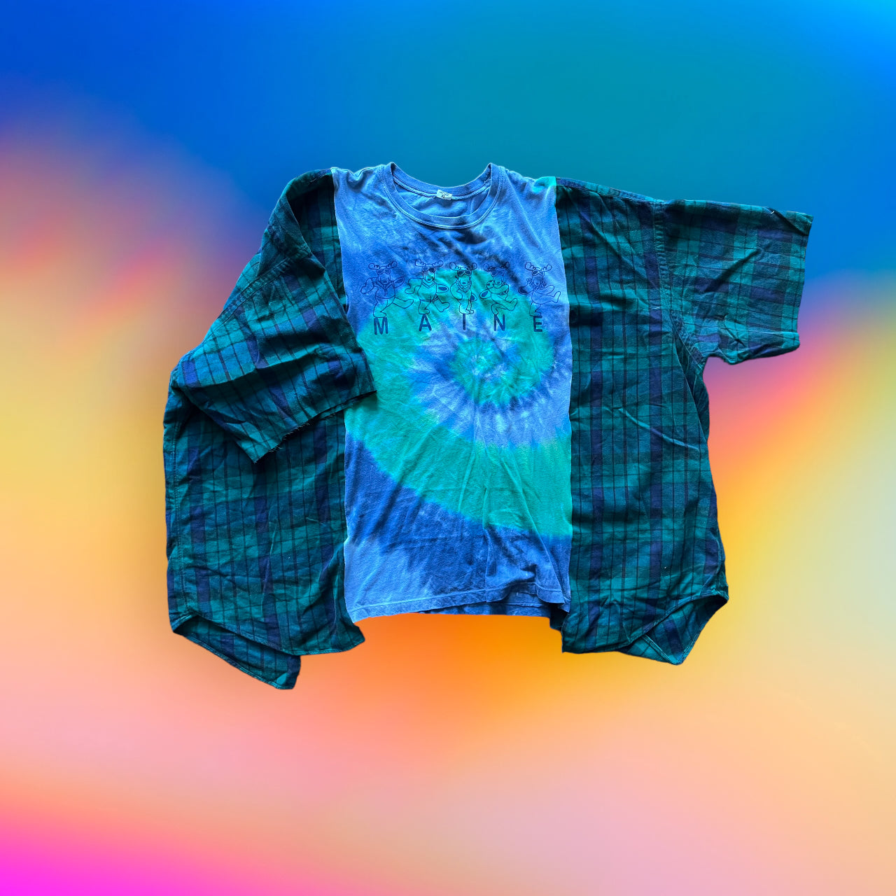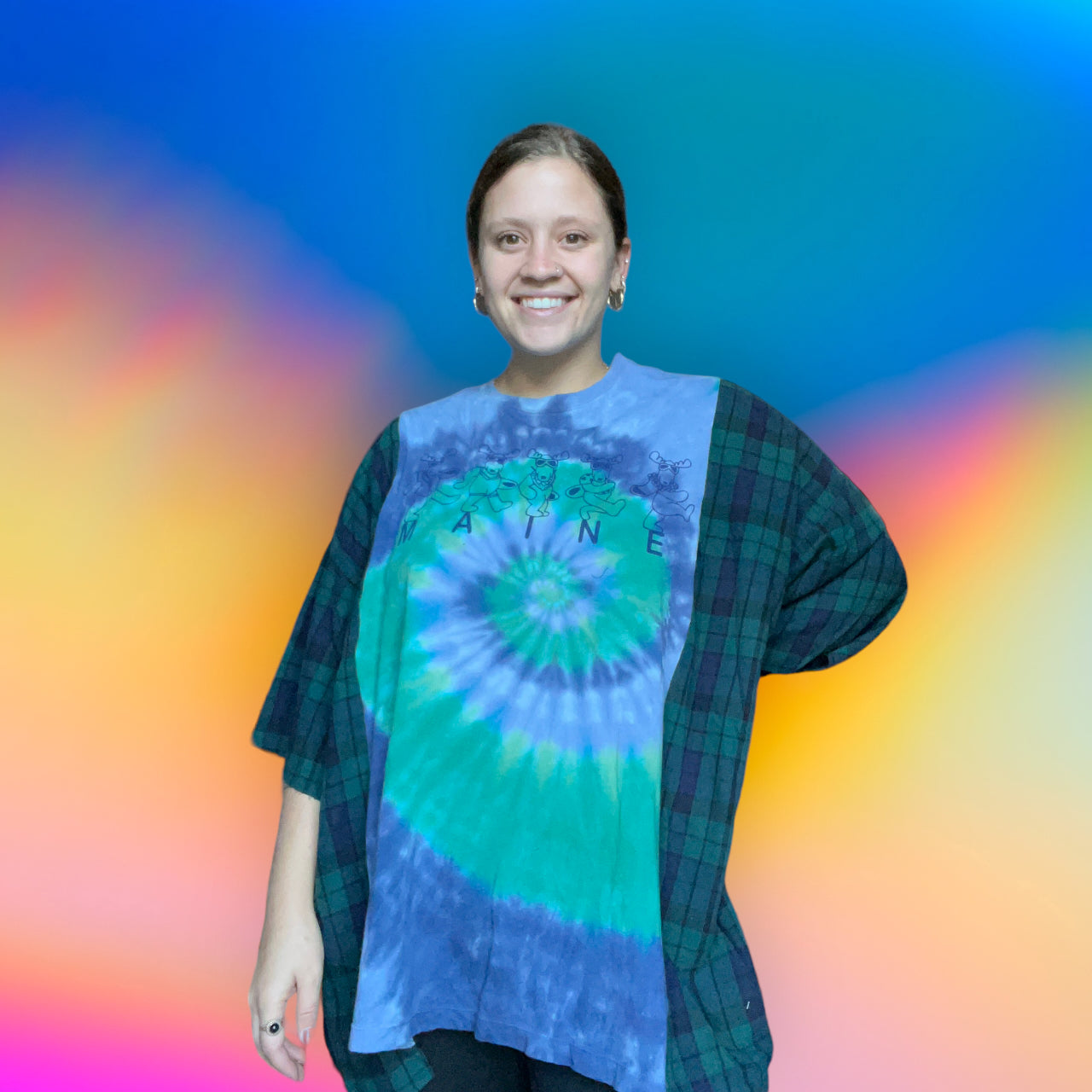 Cut off flannel sewn together with a funky dancing moose tie dye t. XXXL and very soft.