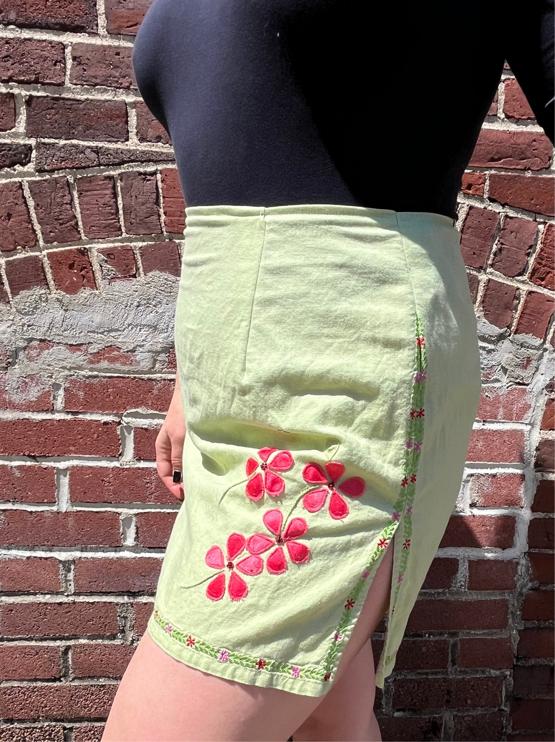 This skirt was made from the bottom of a maxi dress. Grace added a zipper to the back, pleats to the front & back as well as closed up the sides of the skirt. No stretch.