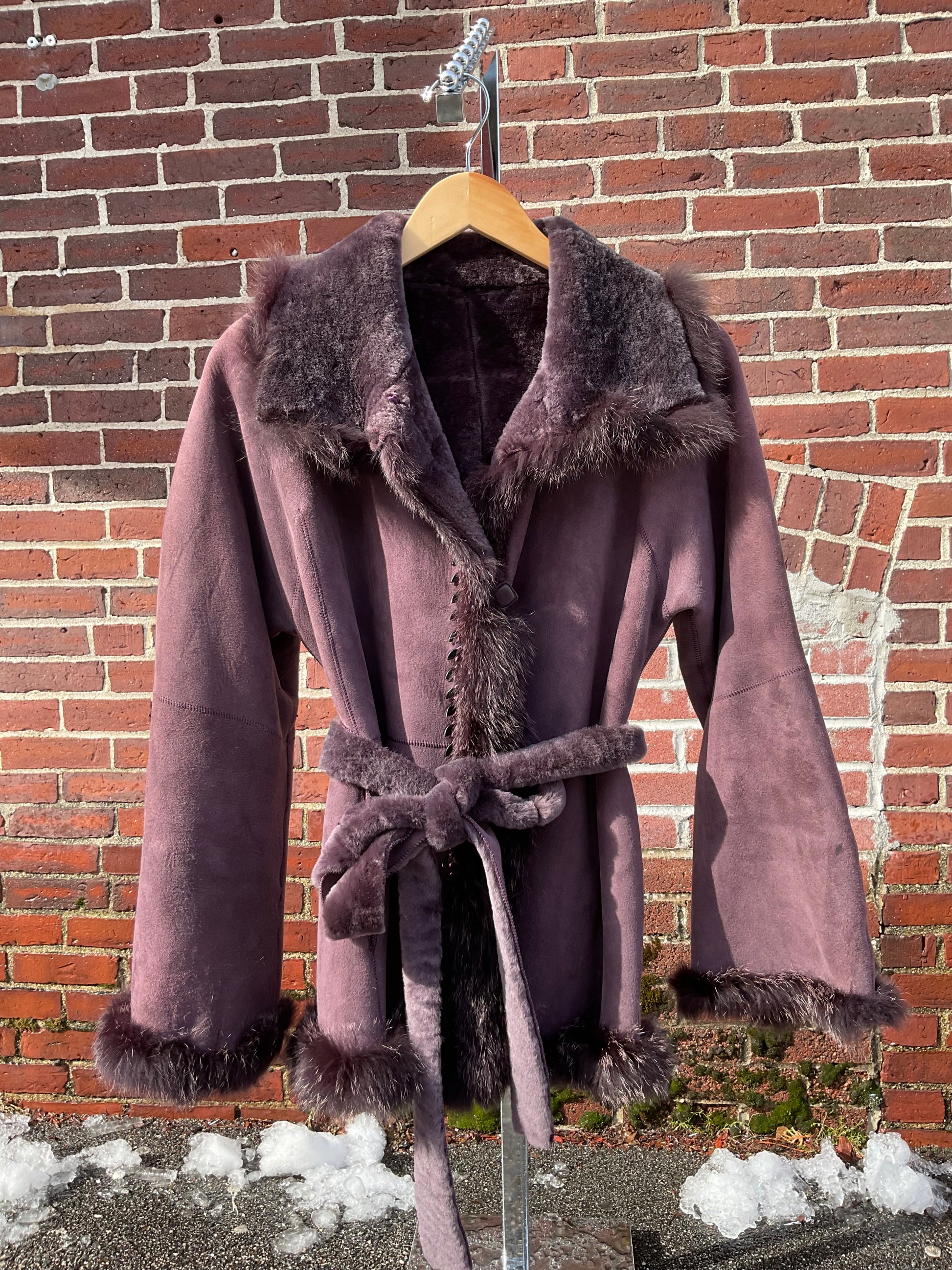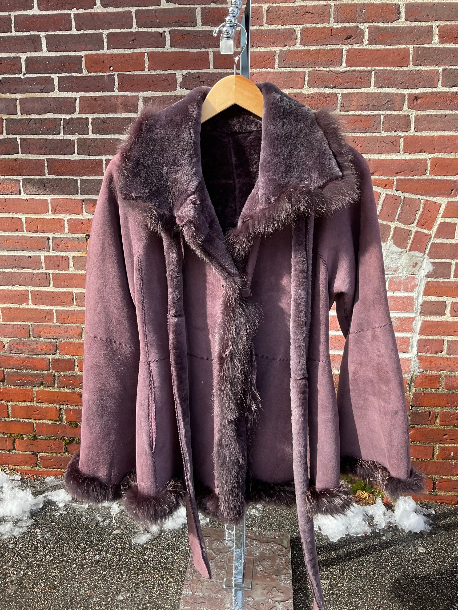 Florence Mode size small leather faux fur coat. This coat is fabulous. It has a belt, two buttons as closures and embroidery on the jacket edge.