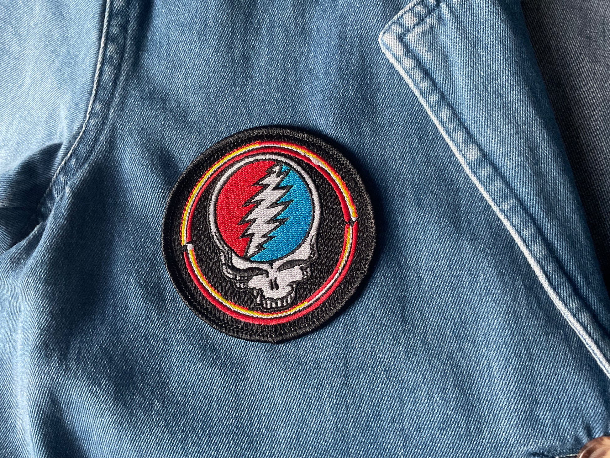 Size 6 denim blazer with grateful dead patch sewn on. The denim is a medium weight with stretch.