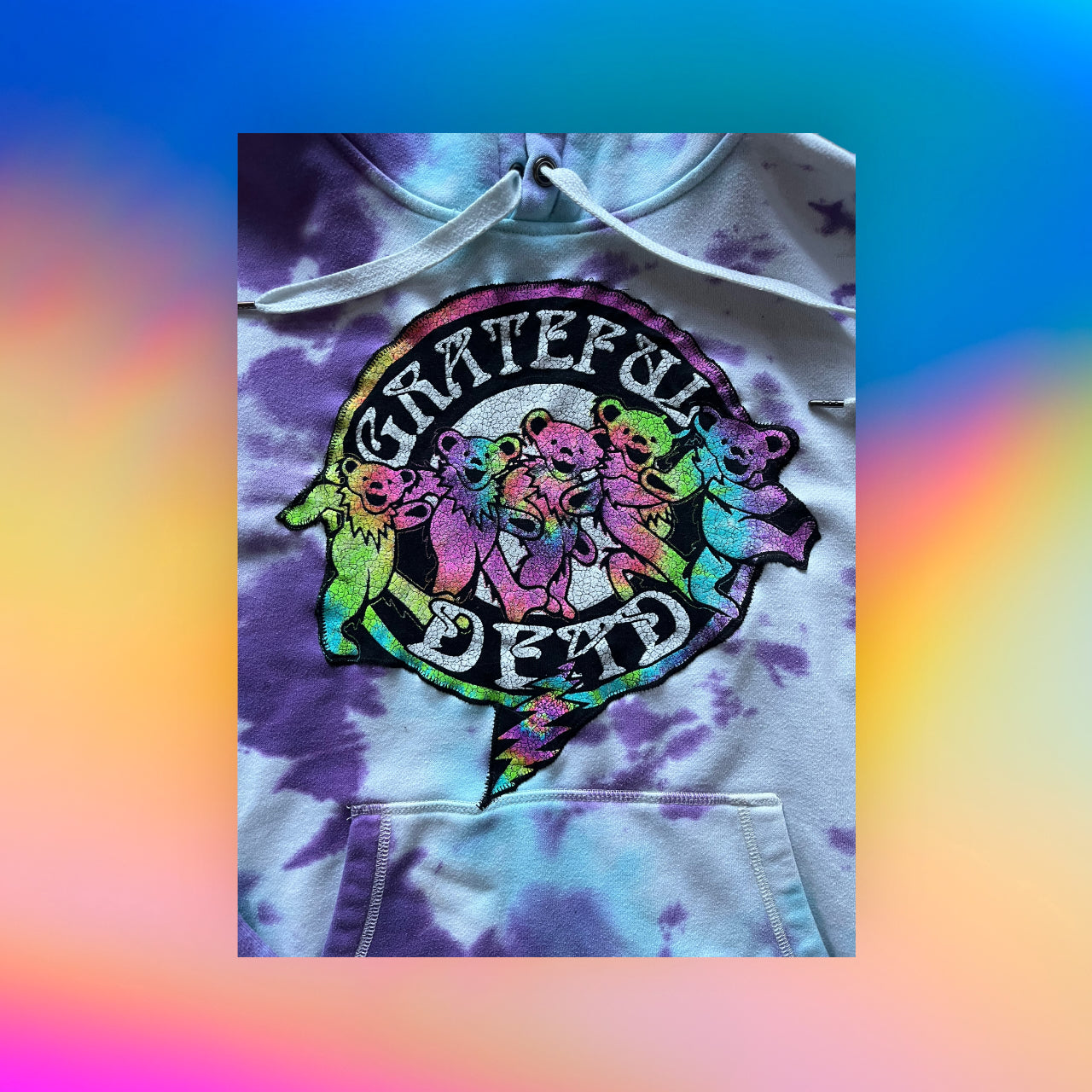Tie dye hoodie with a Grateful Dead logo cut off of a shirt & sewn onto the front. Shirt had rips so we reused the logo!! Size medium