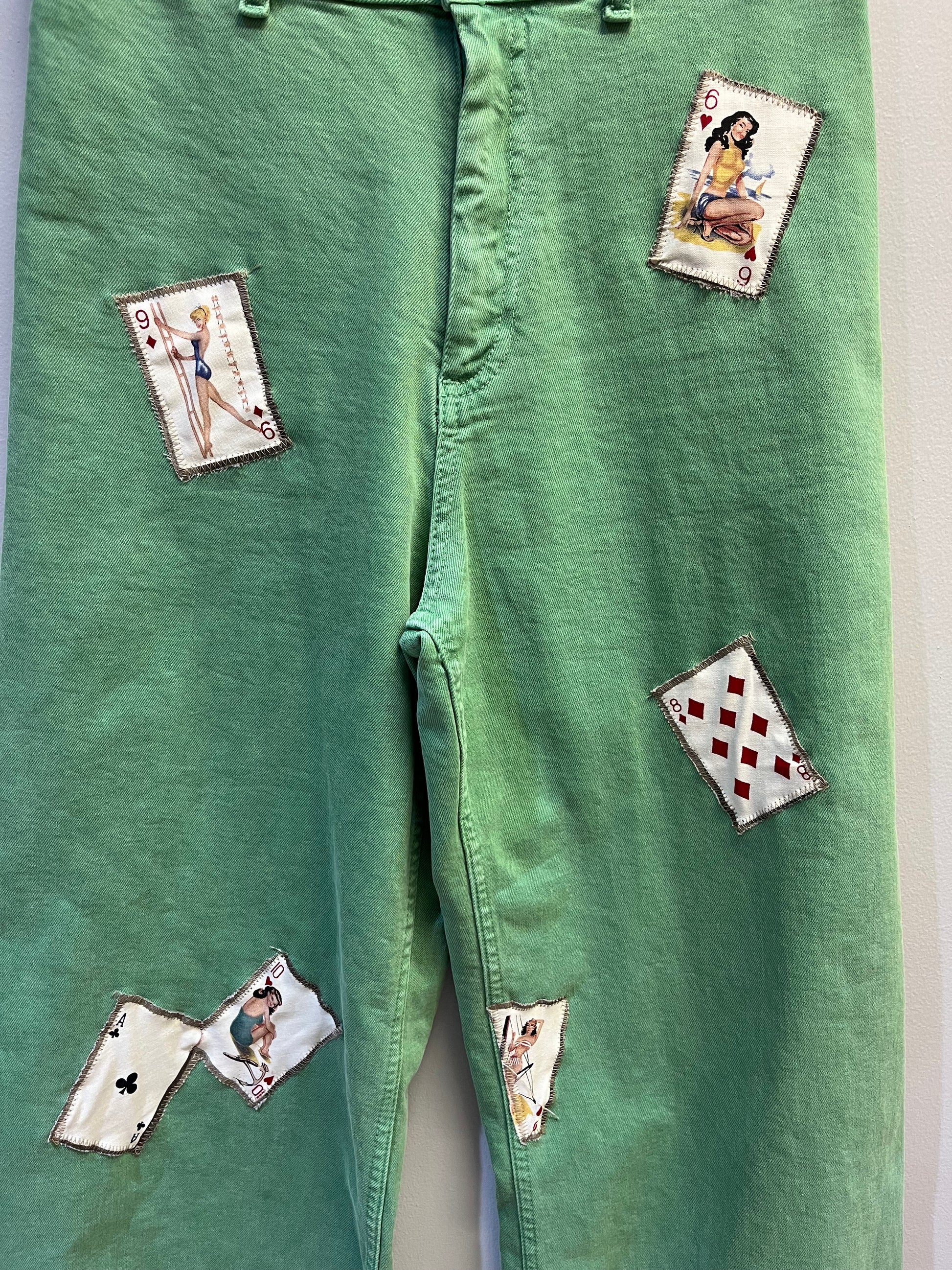 size 6 stretchy green jeans, upcycled with card patches sewn on.