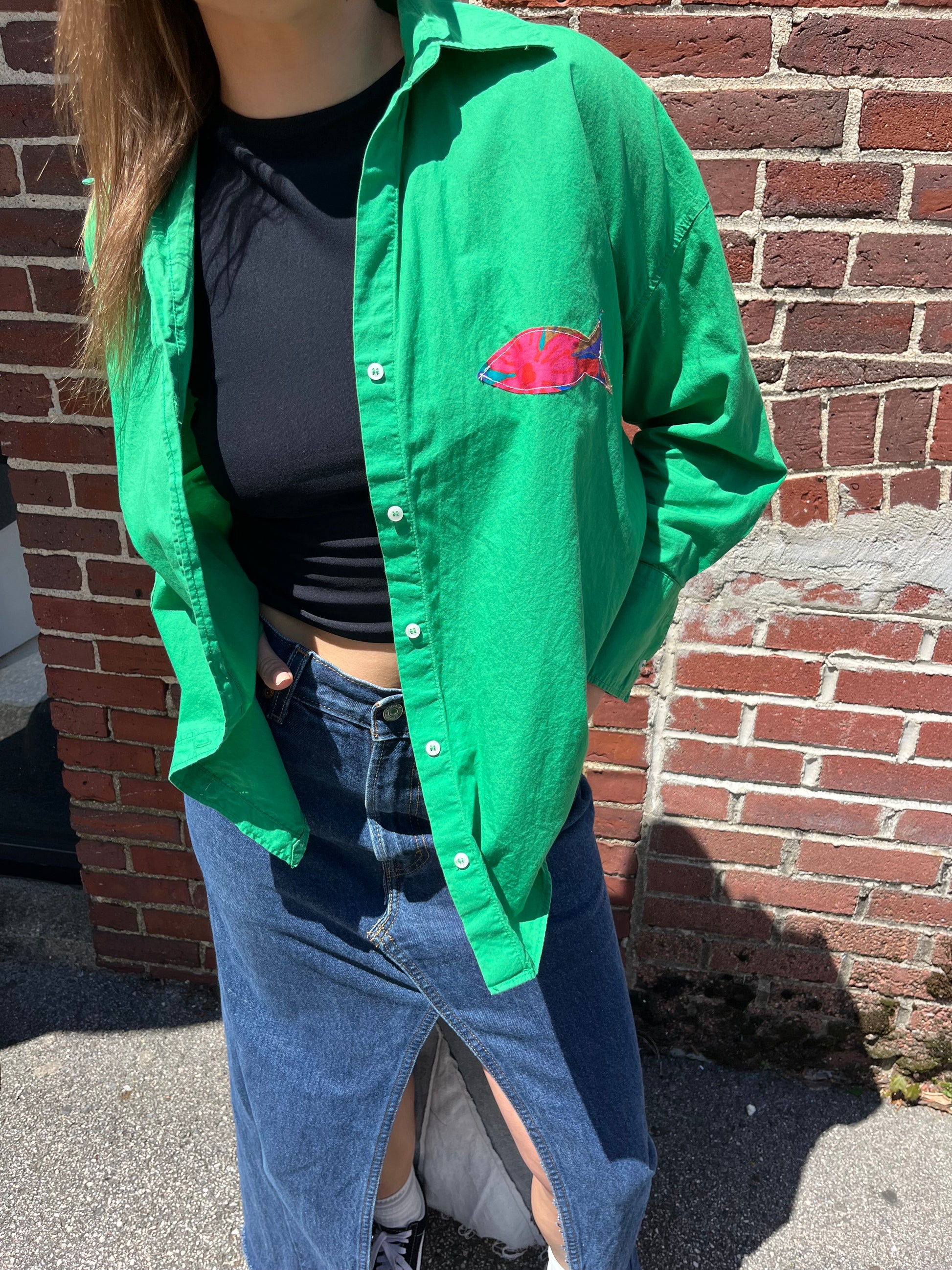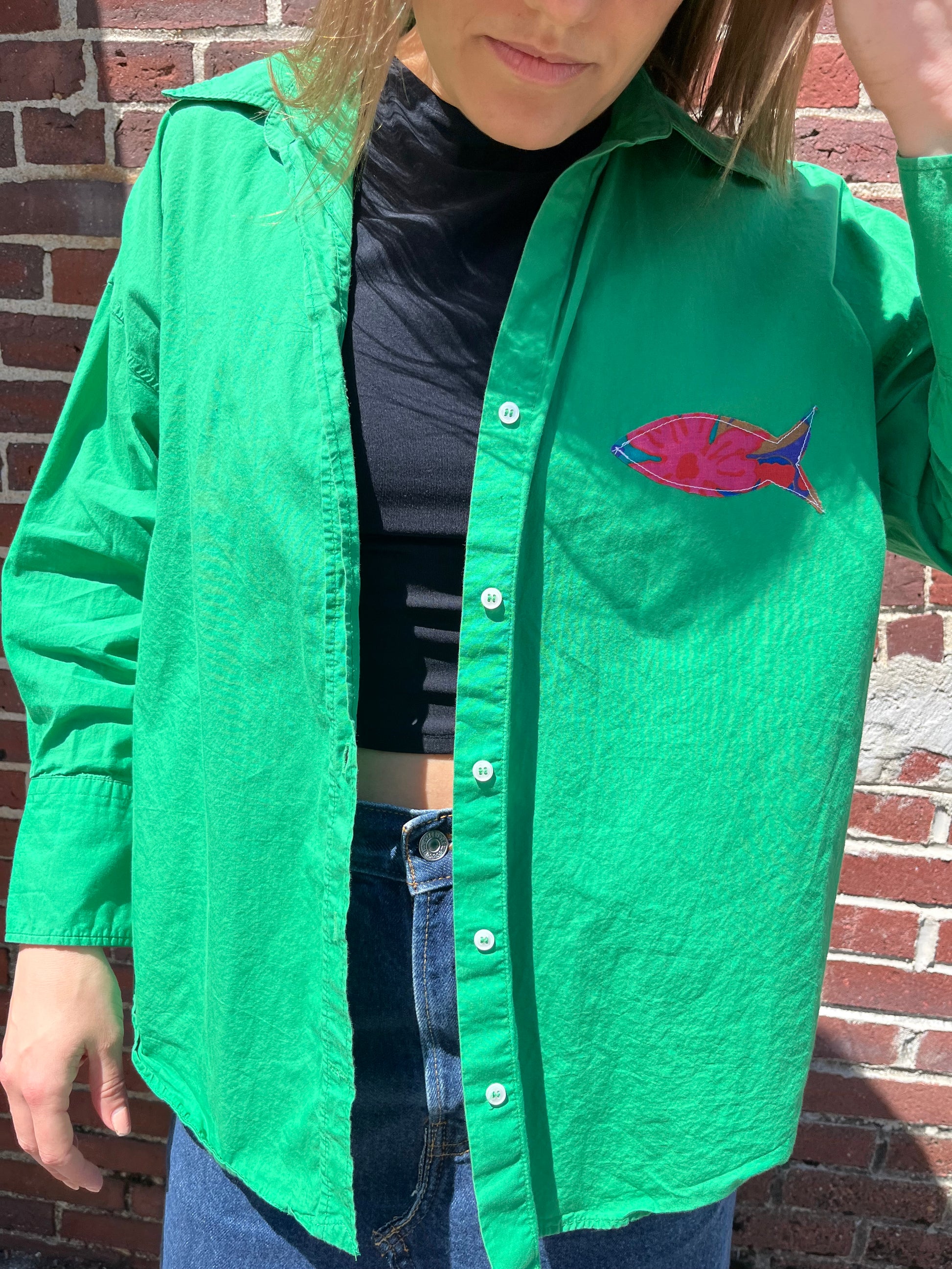 Size medium button down shirt with lots of stretch. Tiny floral fish sewn on to the shirt to add some flair.