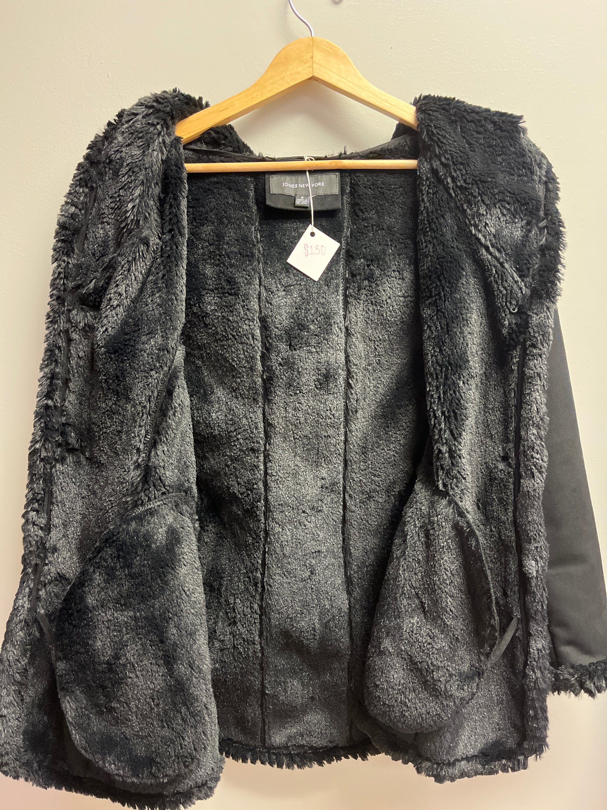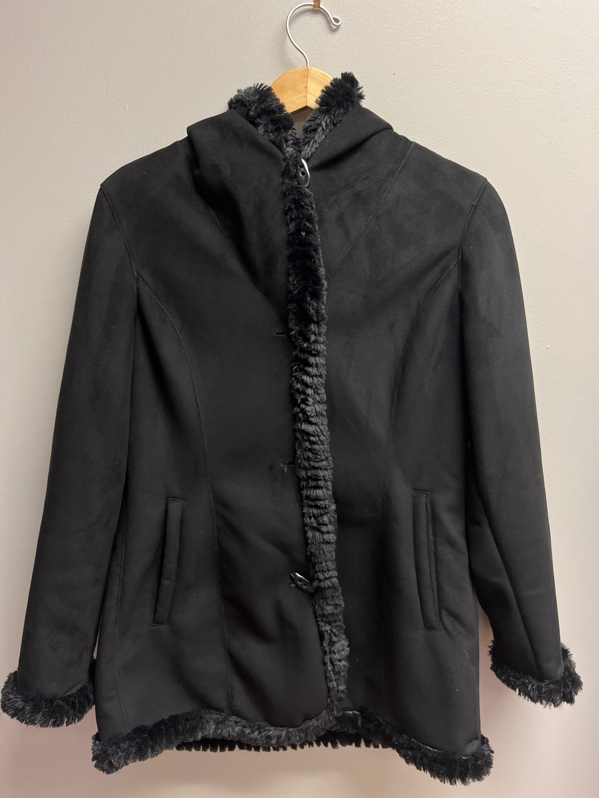 This jacket is a size small. Faux fur & faux leather, but very VERY soft lining that extends into the pockets and hood.