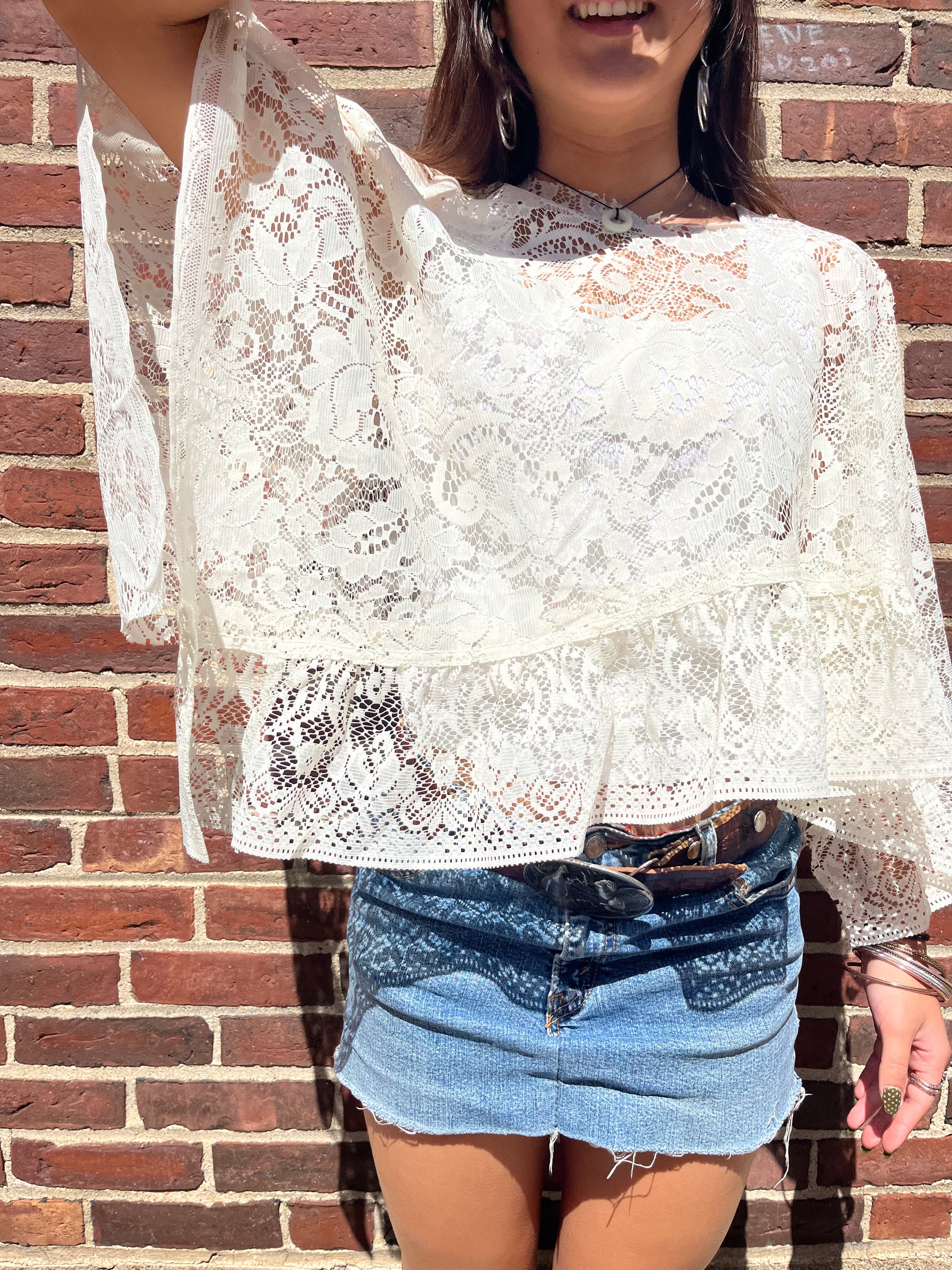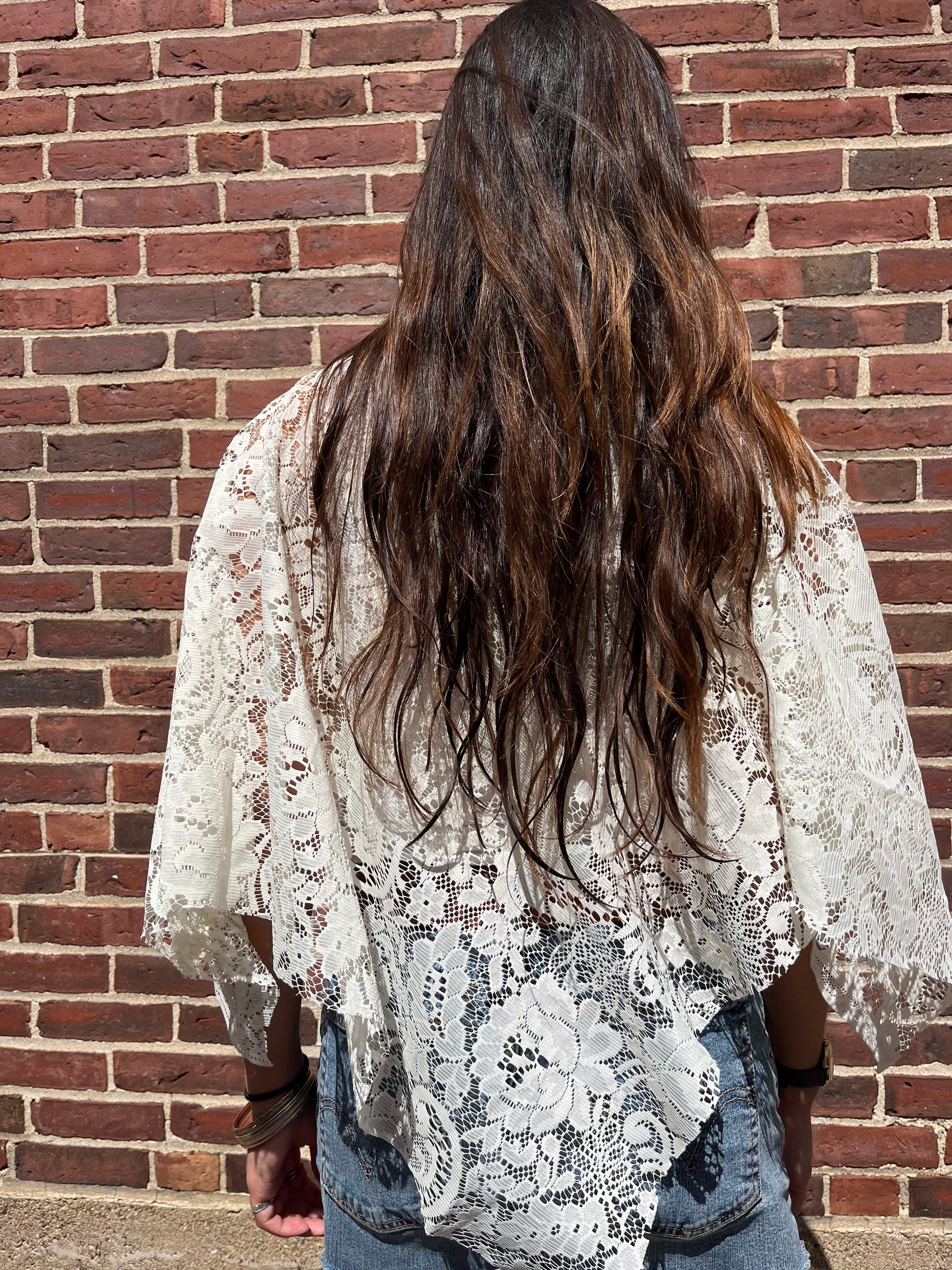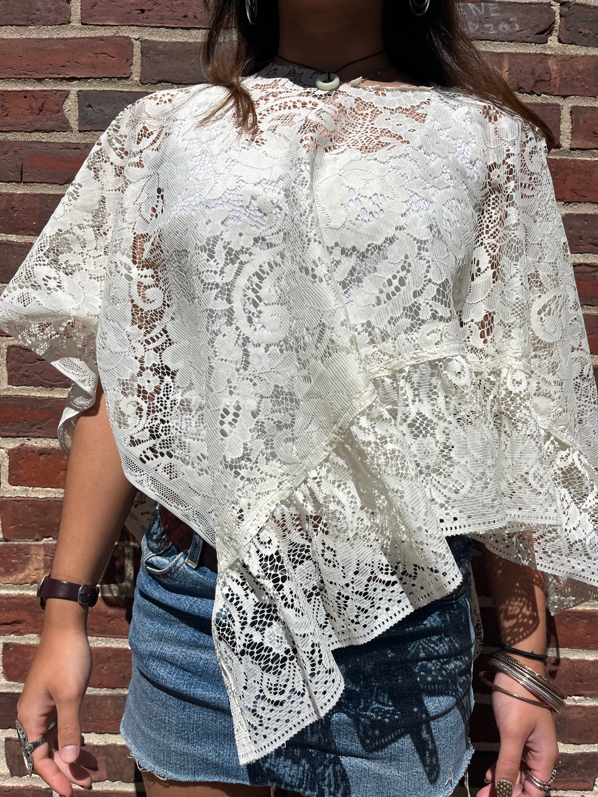 This piece of lace curtain was turned into a poncho. This would fit all sizes. It’s the perfect addition to any summer fit from going out to dinner to going to the beach!