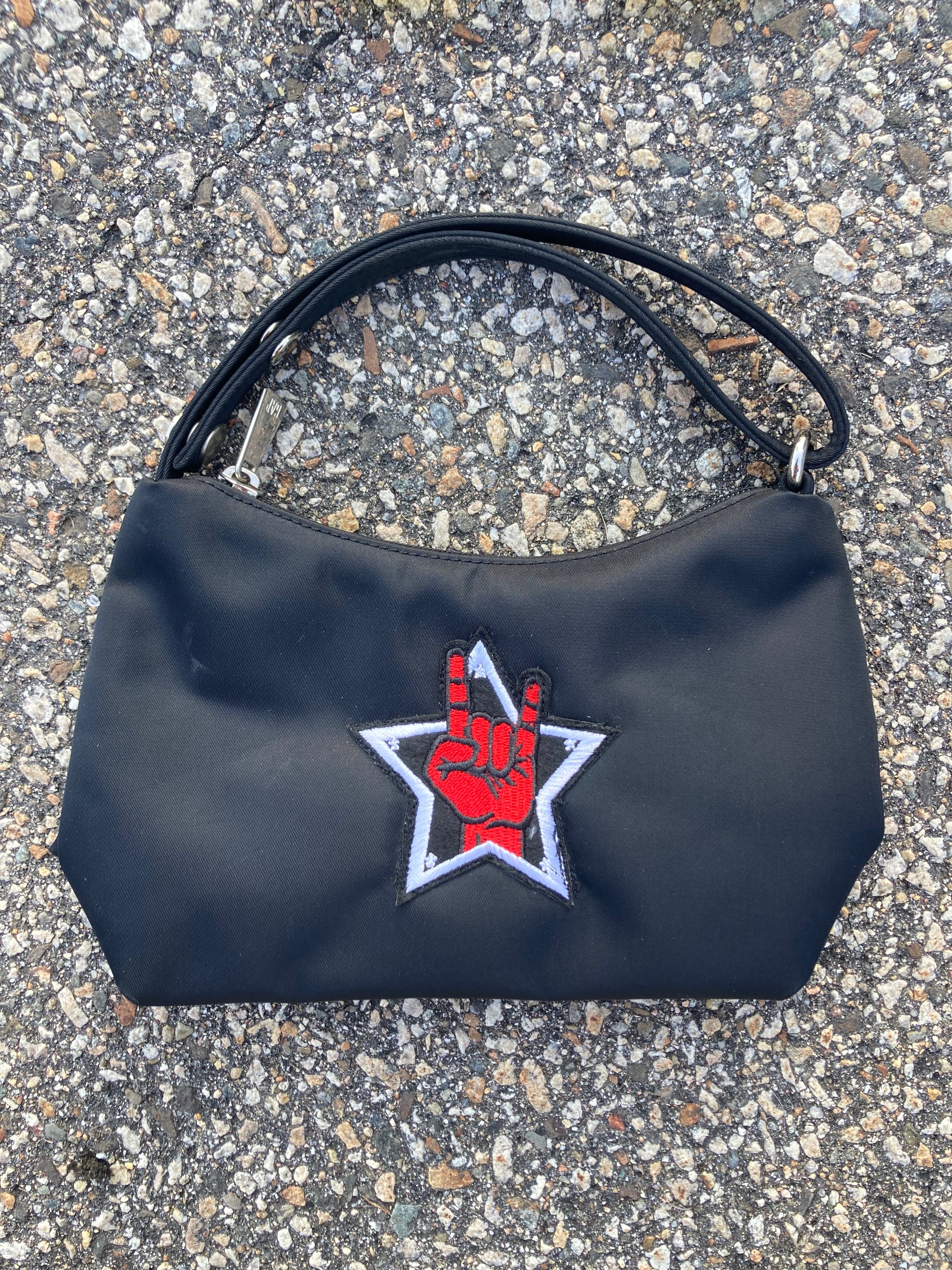 Mini purse with an adjustable strap. 8” wide, 5.5” height. Zipper pocket inside. Patch is sewn on.