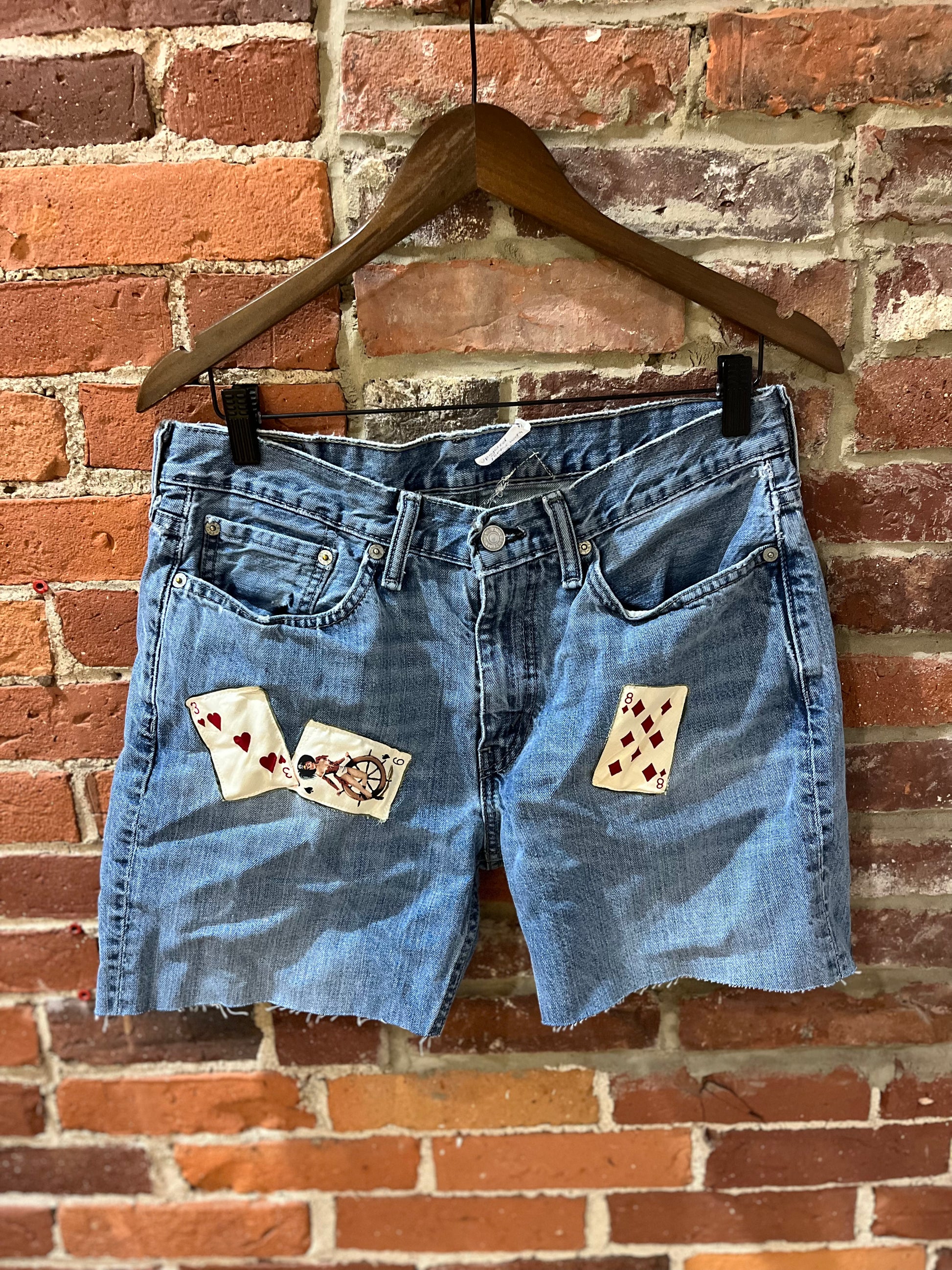 Patch of cards upcycled cutoffs