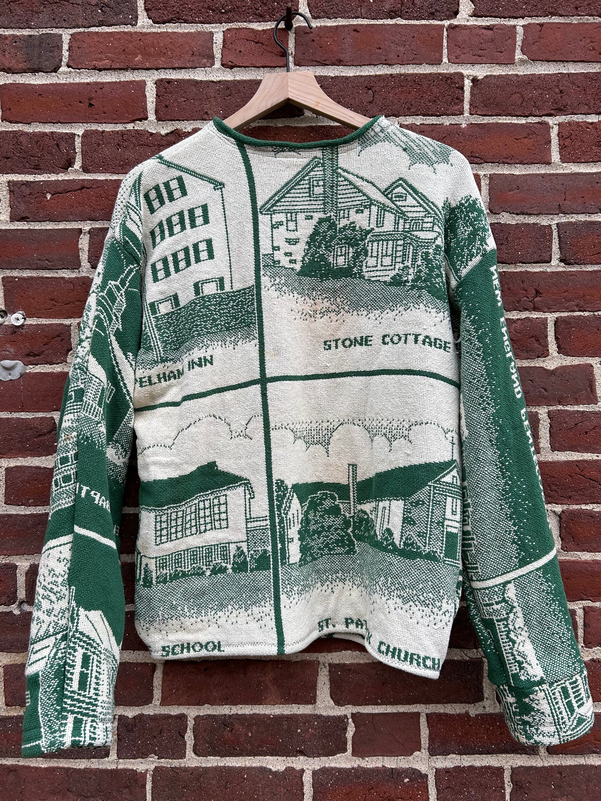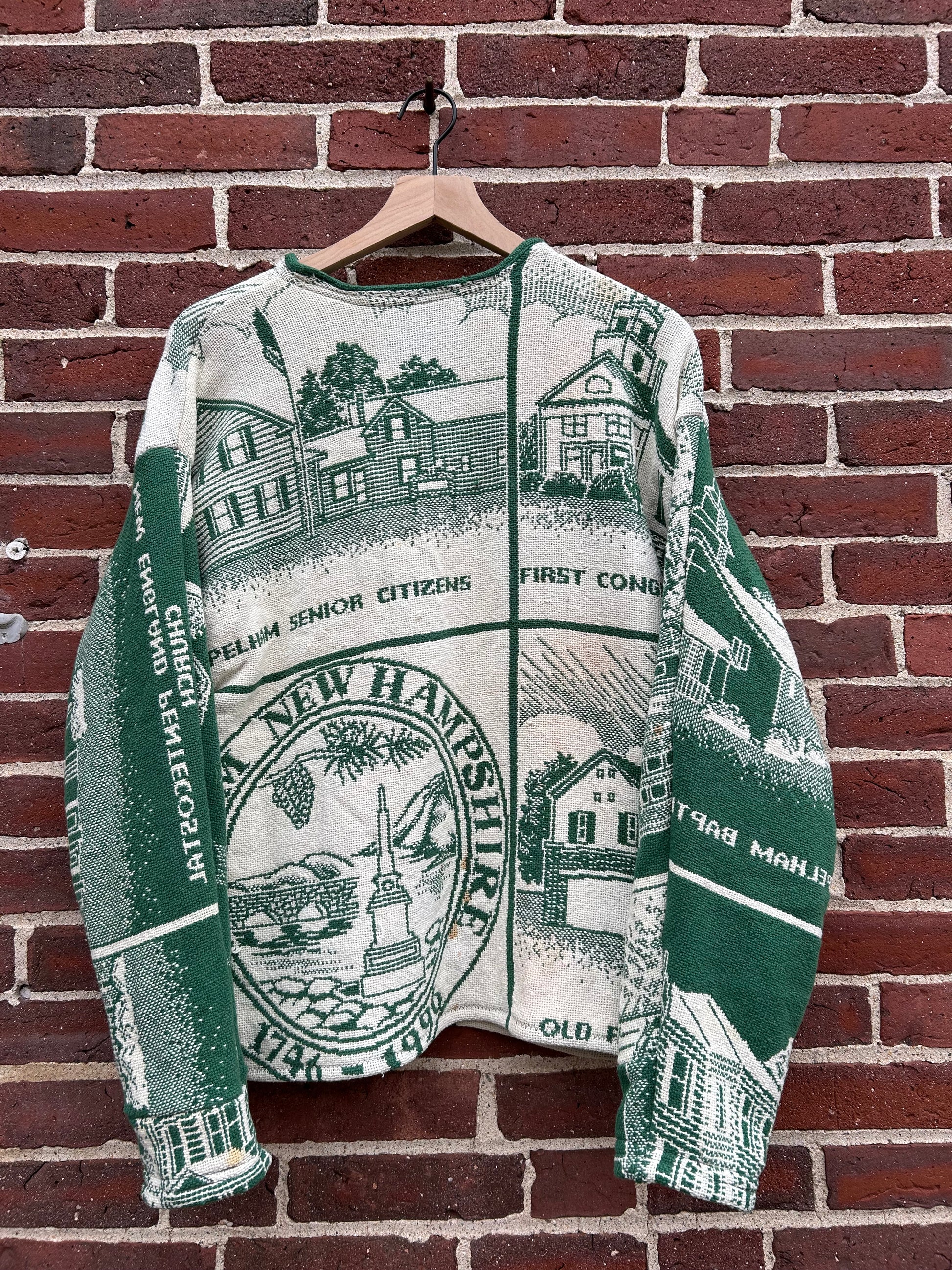 Size small upcycled sweater blanket made from a second hand tapestry blanket.
