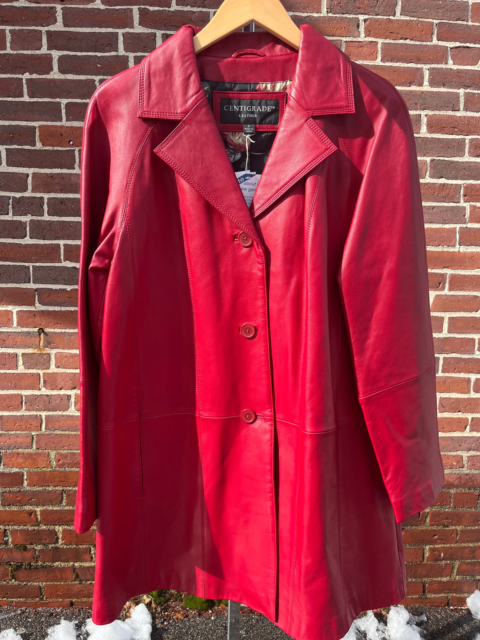 Size small red leather jacket. Blazer style. Would fit size medium as well. Centigrade brand, 100% leather.