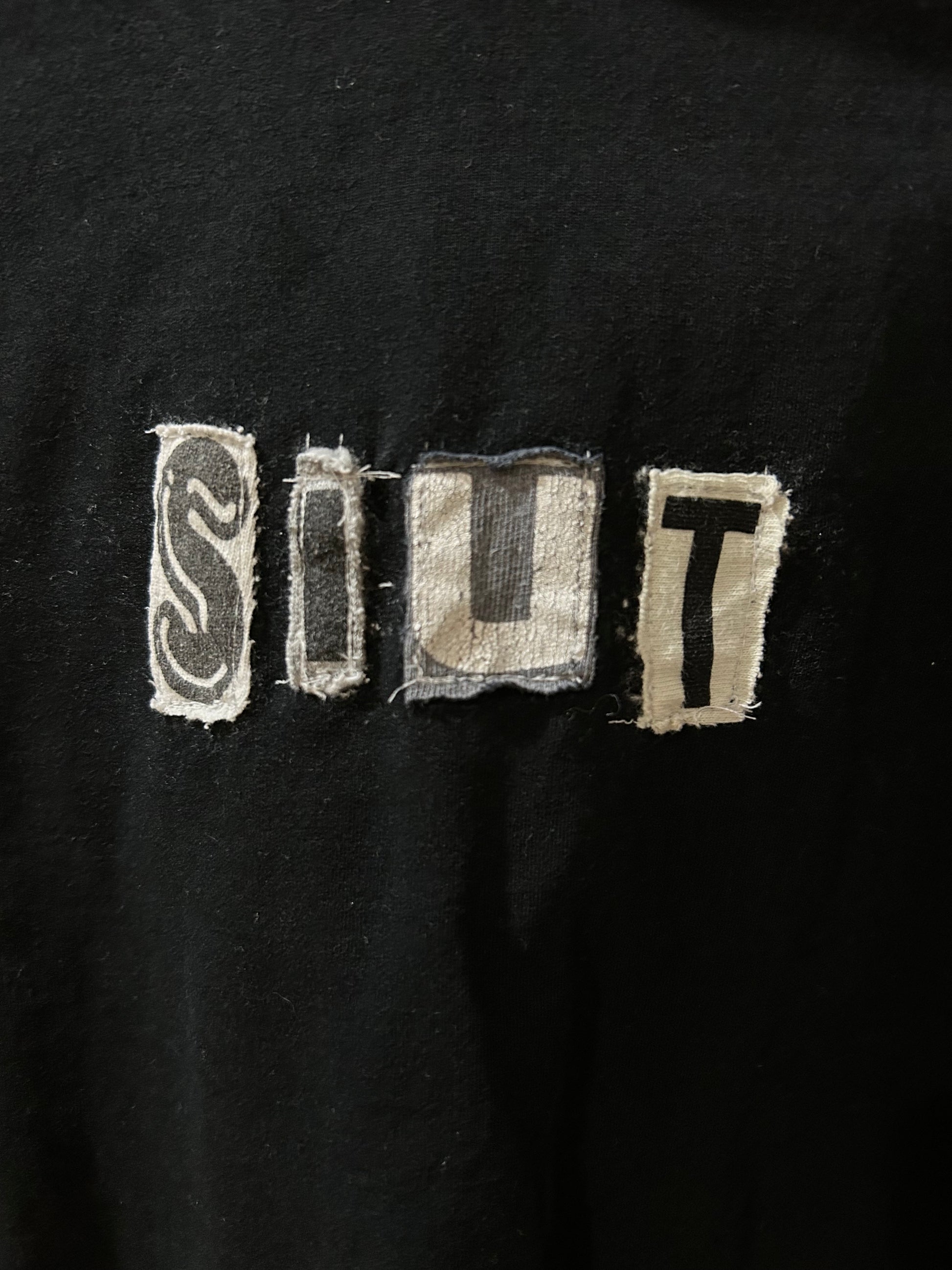 We’re taking the word back! Upcycled with cut out letters from second hand t-shirts. Size medium, cropped.
