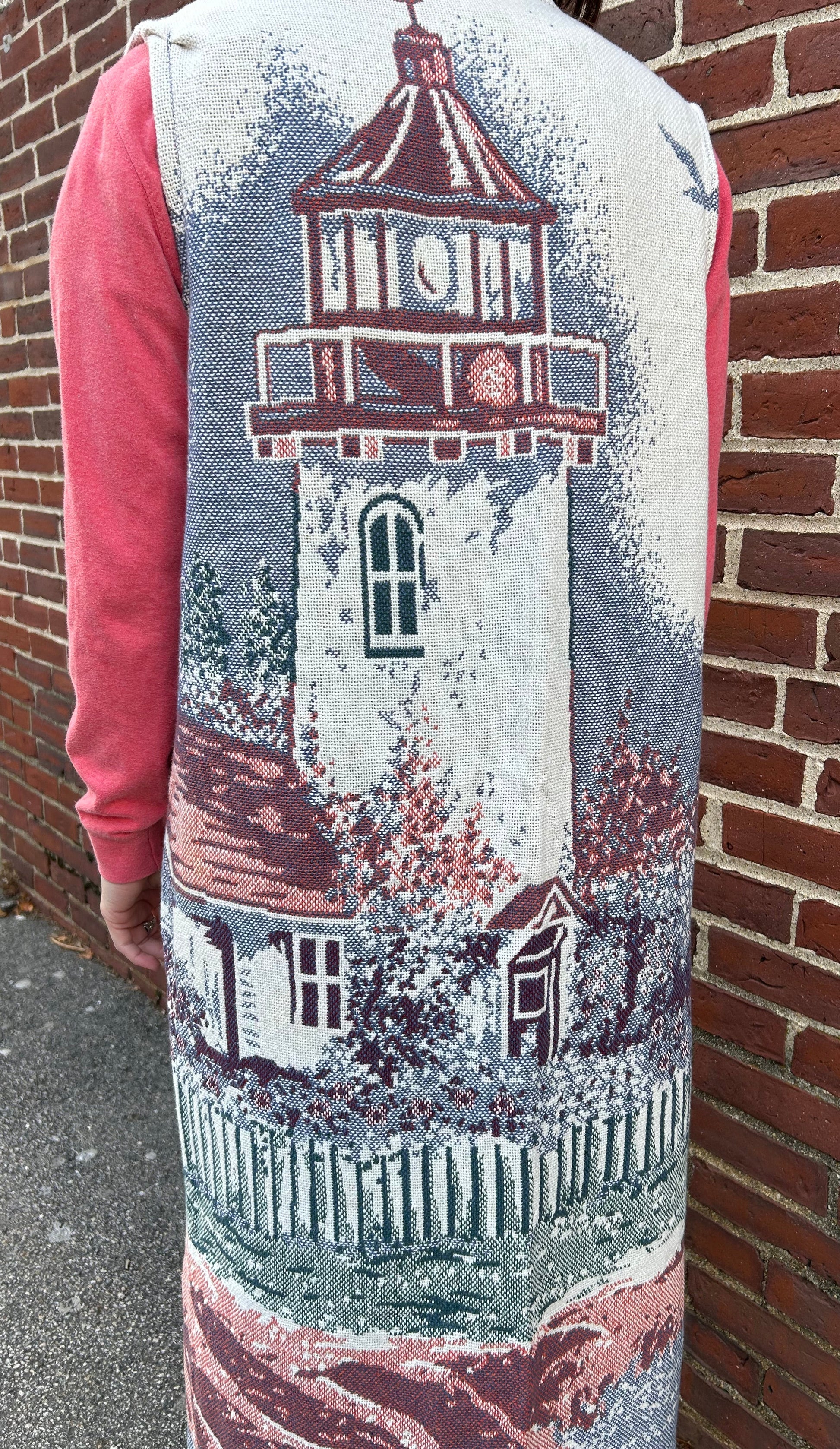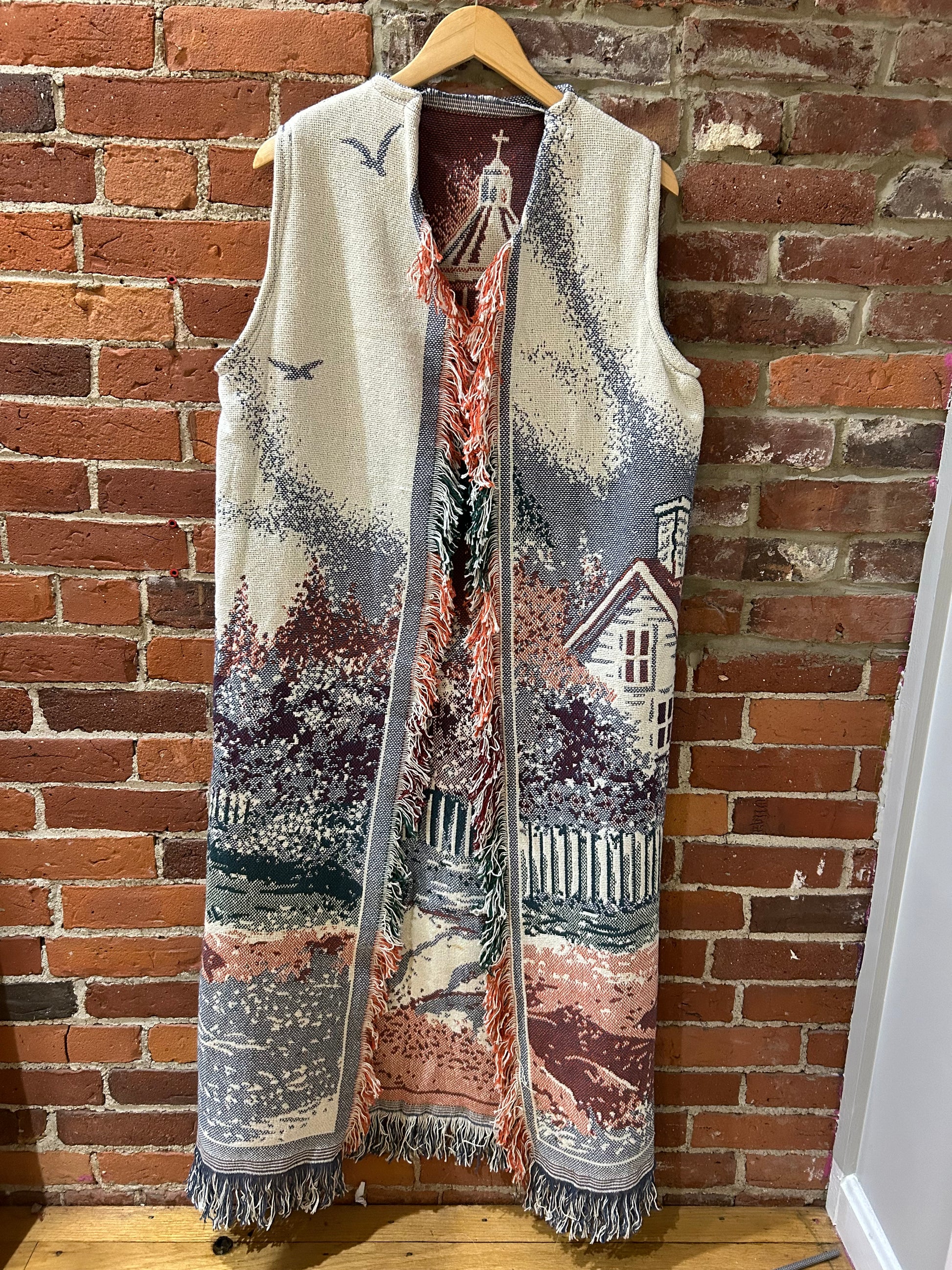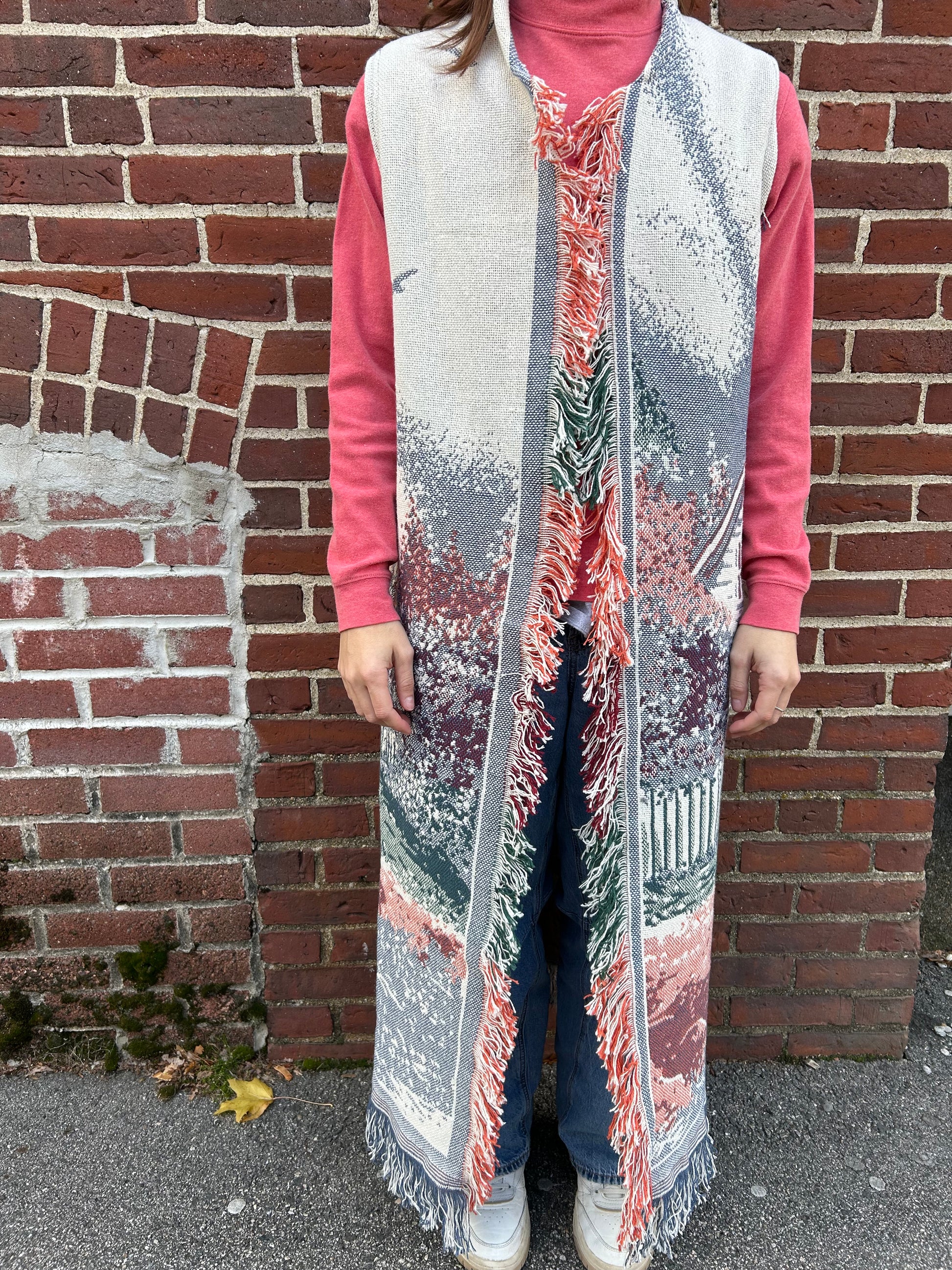 Size small/medium duster vest made from a second hand tapestry blanket. Great for layering in the winter or fall.
