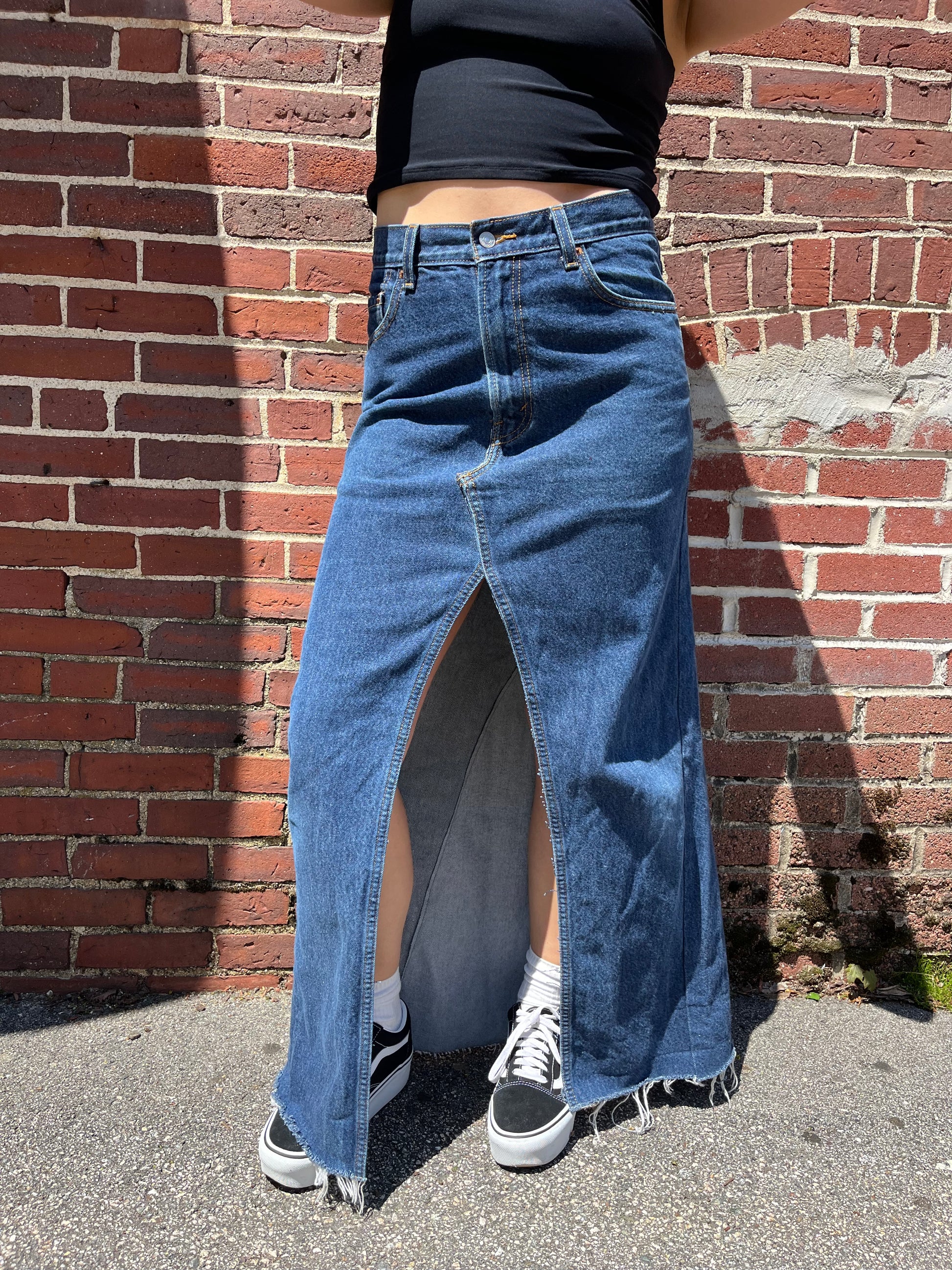 This skirt was originally a pair of jeans. Patches were added to the back to create the funky design on the back of the skirt. Has some stretch to it.