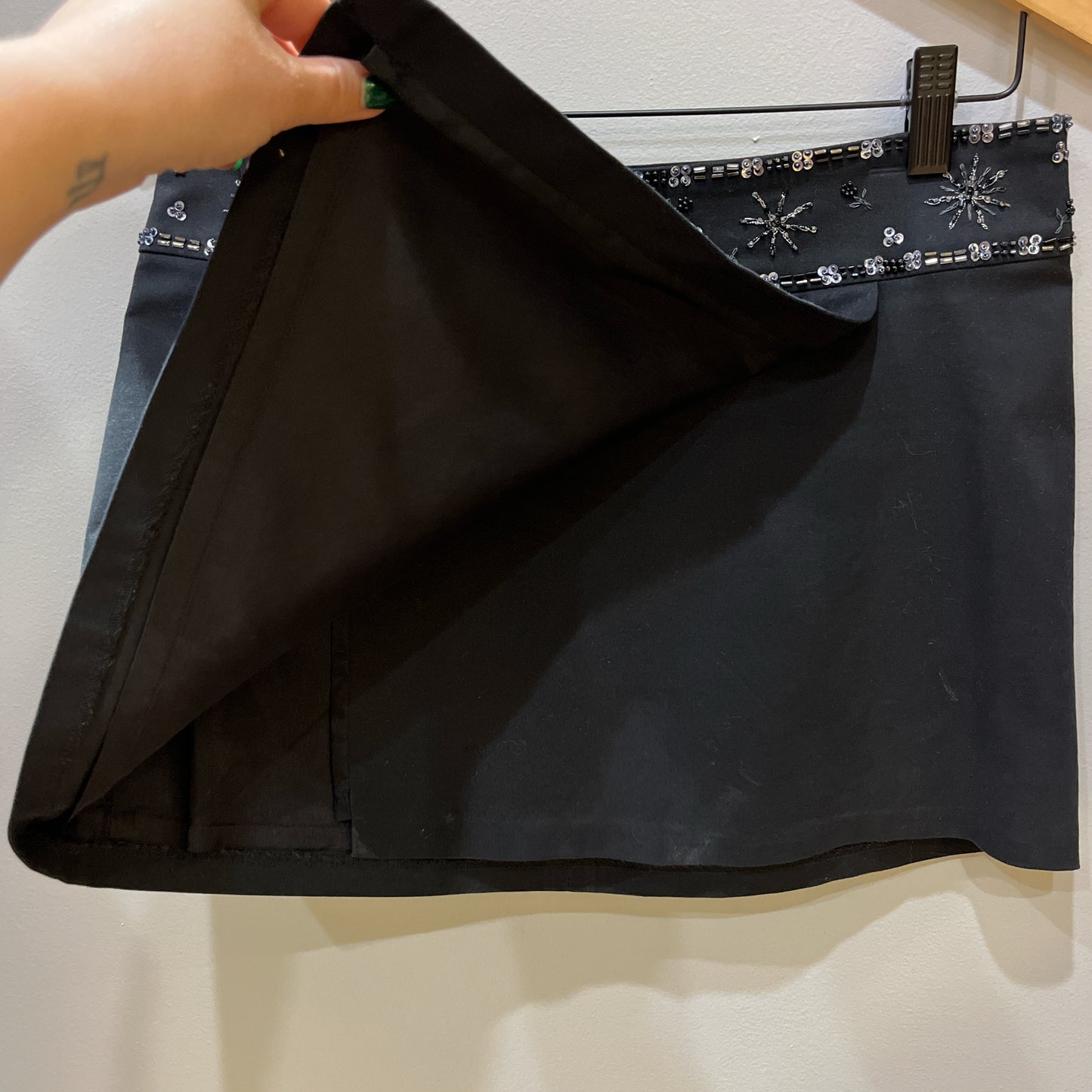 Size 6 black beaded mini skirt. Brand is Laundry by ShelliSegal. It is a wrap around style skirt.